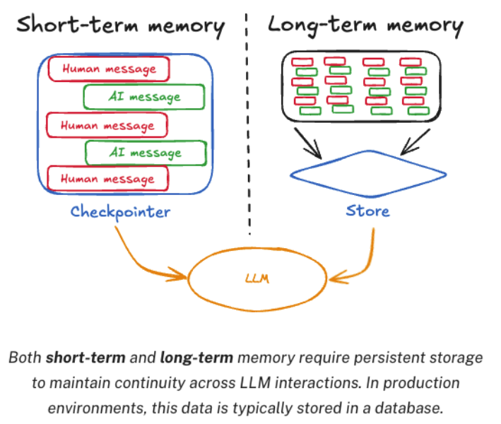 在具体实现时,LangGraph都默认提供了InMemorySaver和InMemoryStore,也同样都可以转移到其他外部存储当中。不过,短期记忆通常是代表那些会话级别的⼩内存,⽽⻓期记忆通常是代表那些⽤户级别或者应⽤级别的⼤内存。