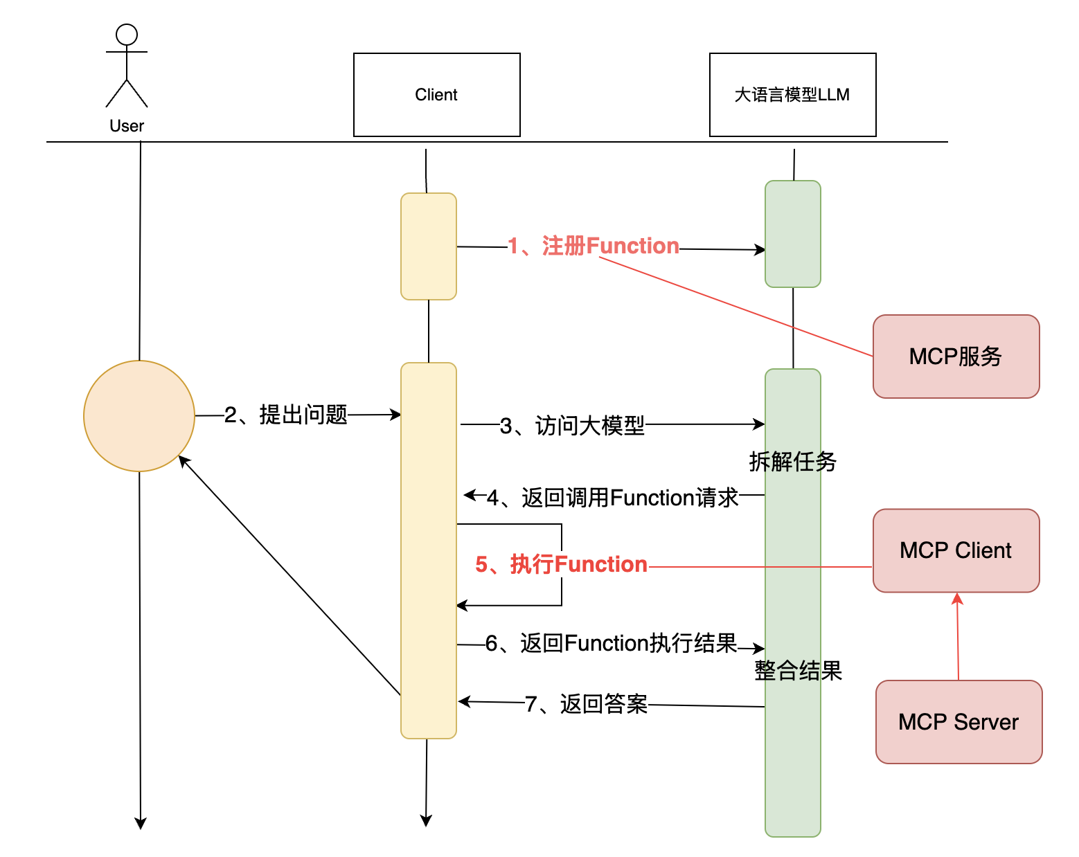 客户端根据⼯具调⽤信息,调⽤⼯具,并将结果返回给⼤语⾔模型。