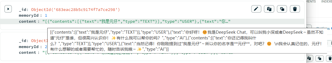 然后我们修改SeparateChatAssistantConfig类,注入MongoChatMemoryStore:@Configuration public class SeparateChatAssistantConfig { @Resource private MongoChatMemoryStore mongoChatMemoryStore; // 这个bean对象用于注入到MemoryChatAssistant中的 // @AiService的chatMemory属性中 @Bean public ChatMemoryProvider chatMemoryProvider() { return memoryId -> MessageWindowChatMemory .builder() .id(memoryId) .maxMessages(10) // .chatMemoryStore(new InMemoryChatMemoryStore()) // 这样配置使聊天记忆以键值对形式存在内存 .chatMemoryStore(mongoChatMemoryStore) // 这样配置使聊天记忆以键值对形式存在mongodb .build(); } }最后就是激动人心的测试环节,再次执行我们之前的