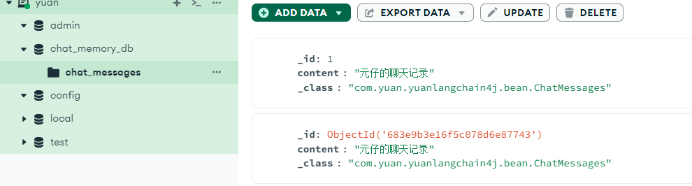 ChatMessages文件import lombok.AllArgsConstructor; import lombok.Data; import lombok.NoArgsConstructor; import org.bson.types.ObjectId; import org.springframework.data.annotation.Id; import org.springframework.data.mongodb.core.mapping.Document; /** * ChatMessages - com.yuan.yuanlangchain4j.bean * 描述:此类由 Alexavier·元仔 创建 */ @Data @AllArgsConstructor @NoArgsConstructor @Document("chat_messages") public class ChatMessages { //唯一标识,映射到 MongoDB 文档的 _id 字段 @Id private ObjectId messageId; //自动生成的id private String memoryId; private String content; //存储当前聊天记录列表的json字符串 }接着我们进行CRUD的测试,编写测试类如下: