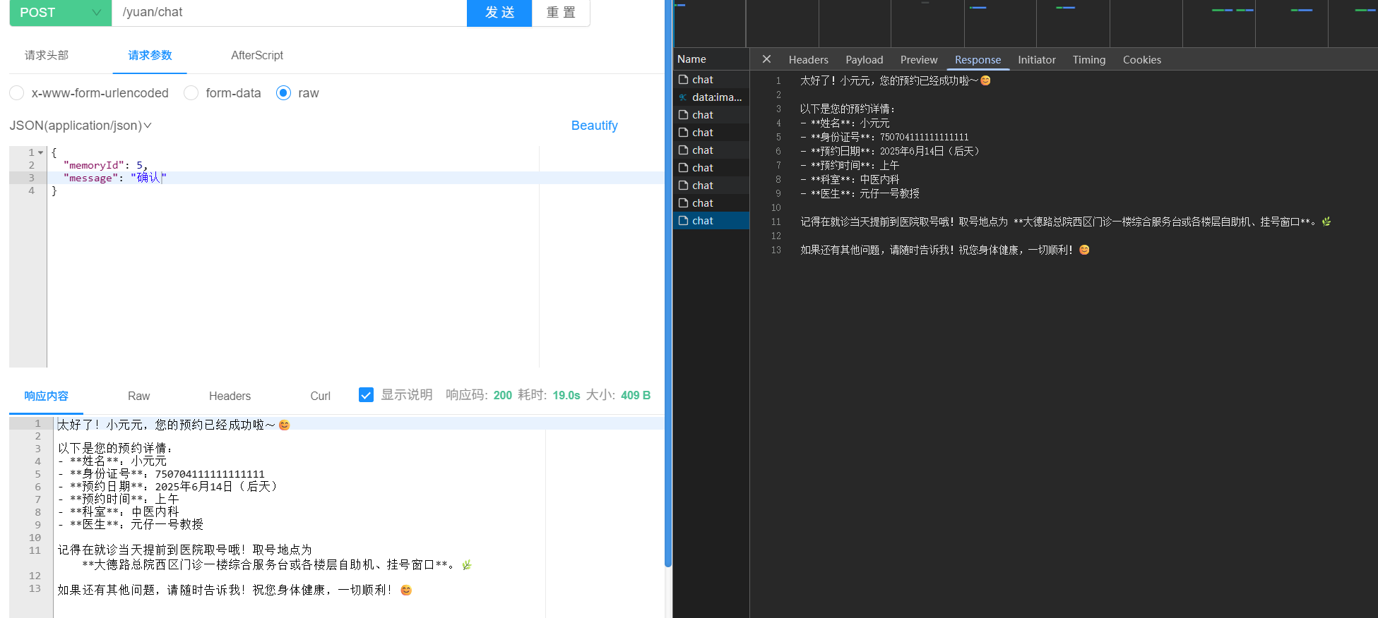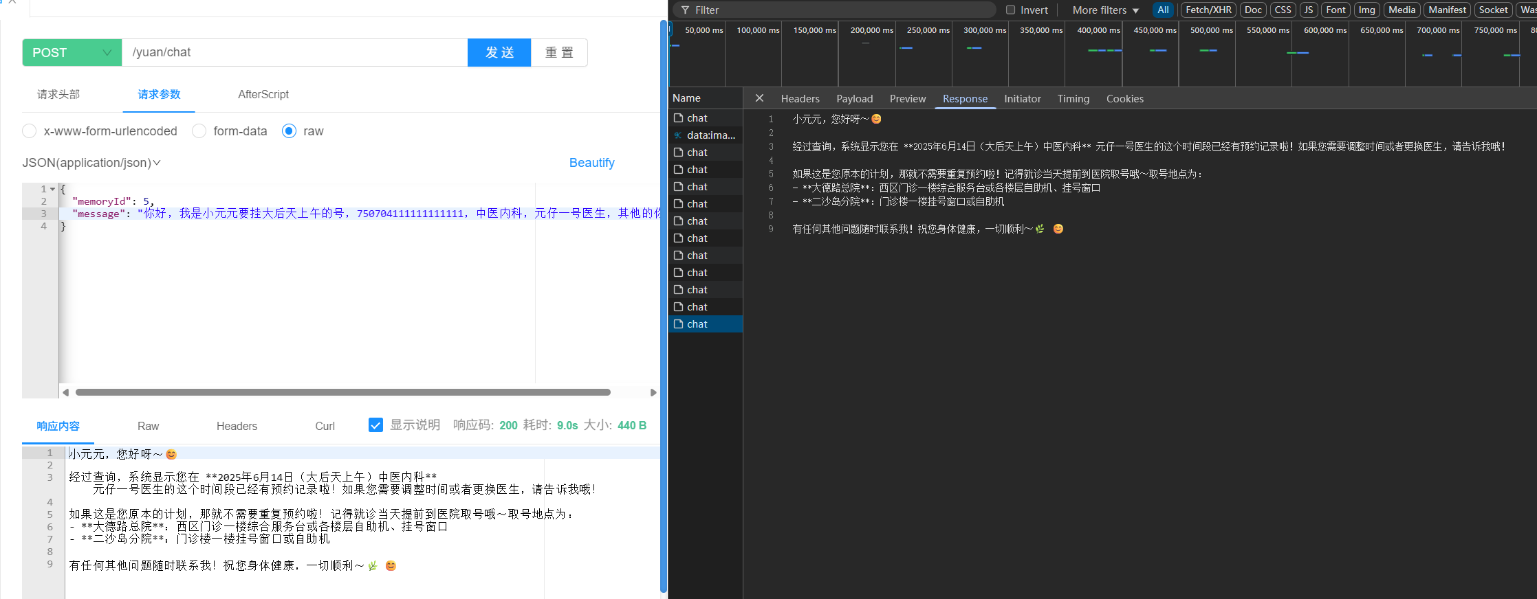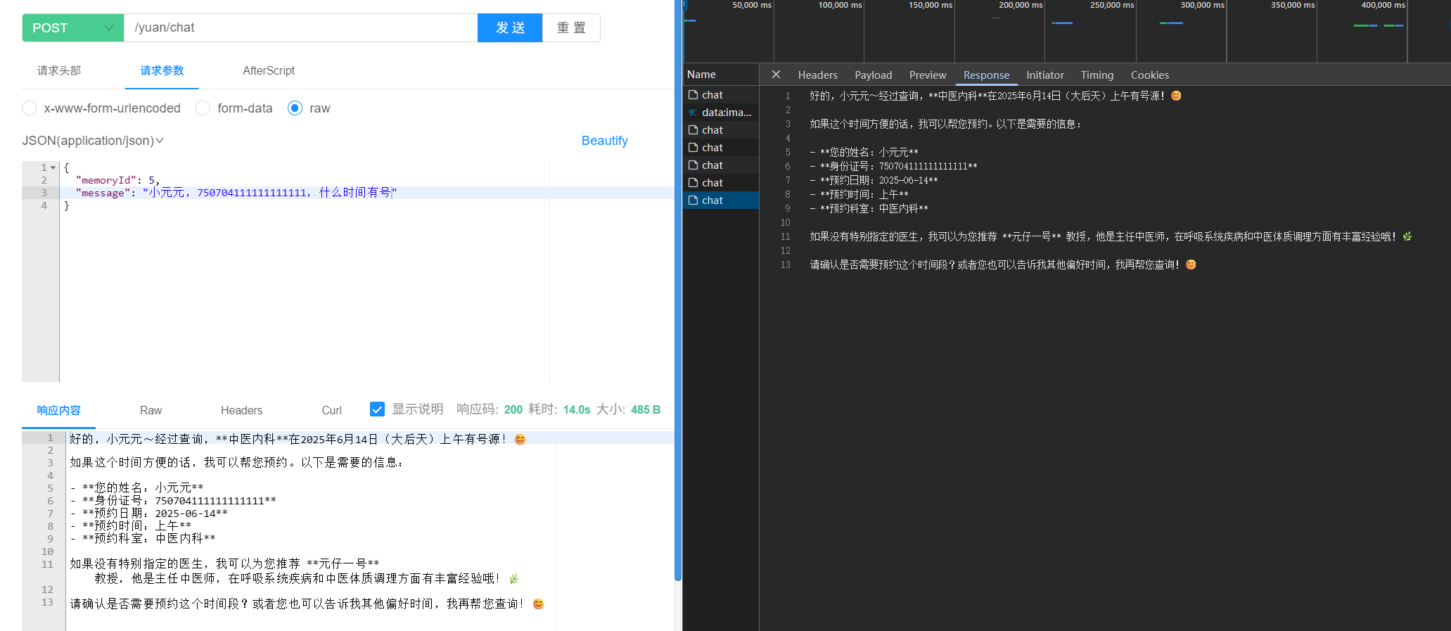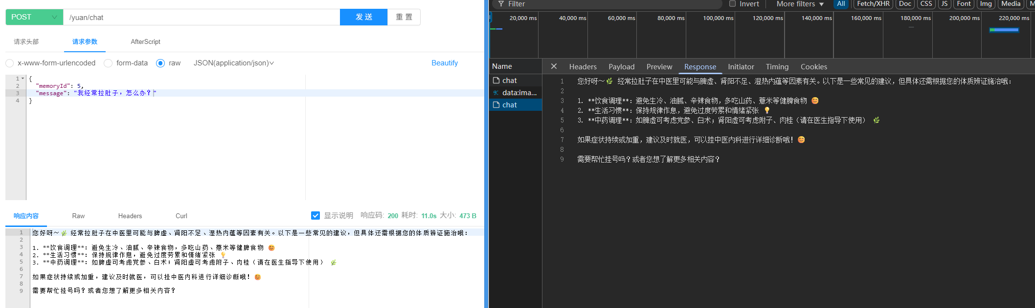 启动程序后我们打开swagger的调试,输入信息就可以看到回复,需要注意的是,流式输出的效果只能在开发者面板F12->Network->Response的chat中看到: