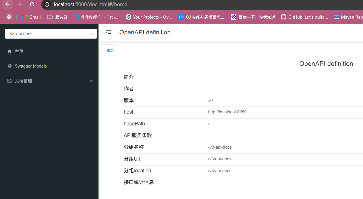 # 端口号 server.port=8080 #langchain4j配置ds langchain4j.open-ai.chat-model.api-key=sk-bba343560a51492a809bfdbc07ca4550 langchain4j.open-ai.chat-model.base-url=https://api.deepseek.com/v1 langchain4j.open-ai.chat-model.model-name=deepseek-chat #应用程序发送给LLM请求日志和响应日志 langchain4j.open-ai.chat-model.log-requests=true langchain4j.open-ai.chat-model.log-responses=true #把系统日志设置为debug级别 logging.level.root=info运行程序后访问localhost://8080/doc.html检查swagger有无正常运行: