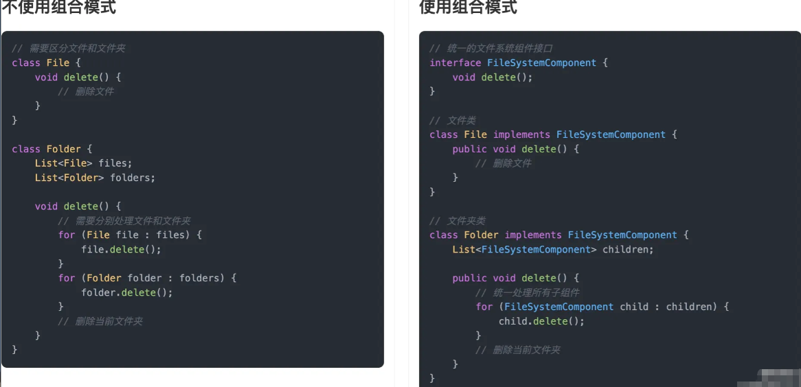 通过对比可以看出,不使用组合模式时,我们需要分别处理文件和文件夹两种不同的类型,这导致了代码的重复和复杂度的增加。每当需要添加新的操作时,都需要在文件和文件夹类中分别实现,而且客户端需要区分处理不同类型的节点。