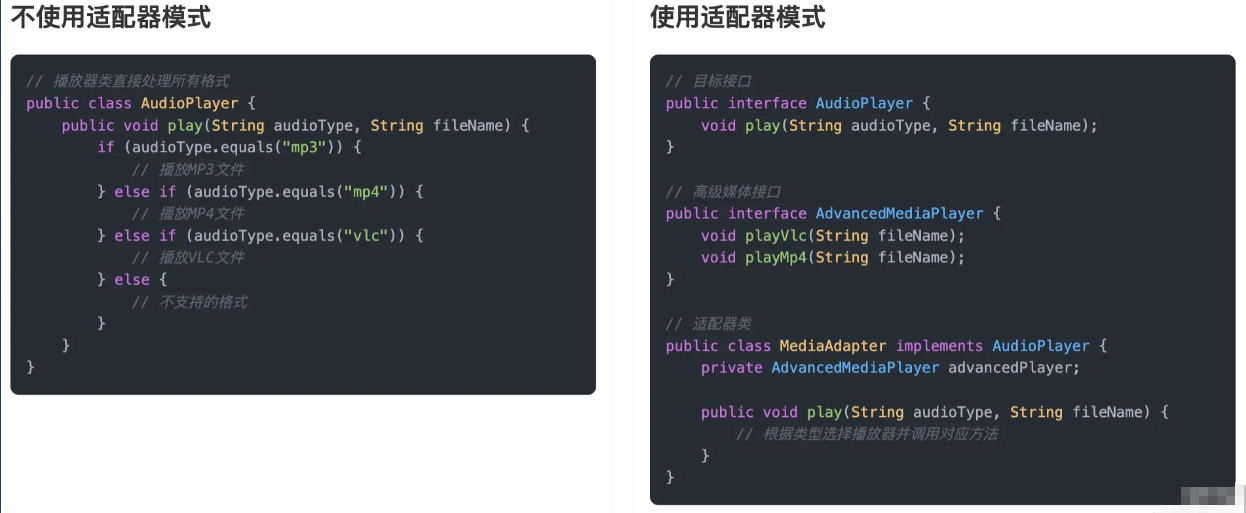 为了让大家更好地感受到适配器模式的作用,以音频播放器为例,我们需要支持多种音频格式(MP3、VLC、MP4等)的播放。让我们来看看使用和不使用适配器模式的区别:
