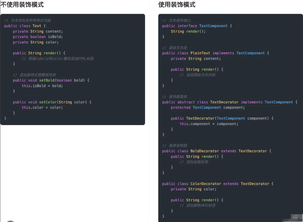 通过对比可以看出,不使用装饰模式时,我们需要为每种文本样式的组合创建单独的方法,这导致了方法的数量过多、代码重复、难以维护等问题。每当需要添加新的样式或组合时,都需要创建新的方法,增加了开发成本。