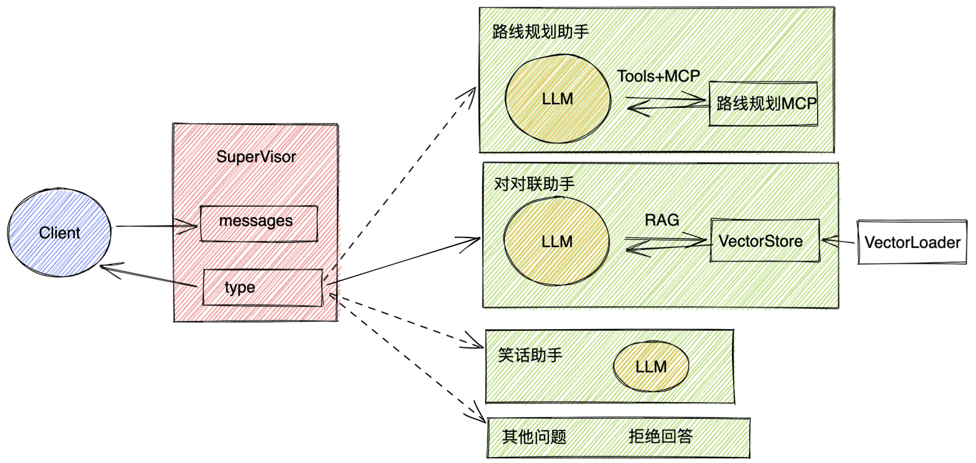 这个机器⼈可以通过⼀个supervisor节点,对⽤户的输⼊进⾏分类,然后根据分类结果,选择不同的agent节点进⾏处理。