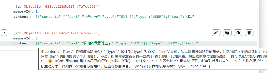 // 实现不同用户的对话隔离 @Resource private SeparateChatAssistant separateChatAssistant; @Test public void aiSeparateChatMemoryAnnotationTest() { String answer1 = separateChatAssistant.chat(1,"我是元仔"); System.out.println(answer1); String answer2 = separateChatAssistant.chat(1,"你还记得我叫什么?"); System.out.println(answer2); String answer3 = separateChatAssistant.chat(2,"你知道我是谁么?"); System.out.println(answer3); //你好呀!😊 我是DeepSeek Chat,可以叫我DeepSeek或者小深~ 很高兴认识你!元仔是你的昵称吗?有什么我可以帮你的吗?✨ // 当然记得啦!你刚刚告诉我你叫**元仔**嘛~😊 我会认真记住每个用户的昵称,所以不用担心我会忘记哦!有什么想聊的或者需要帮忙的,随时告 诉我~✨ // // 目前,我无法直接识别你的身份,因为我们之间的对话是匿名的。我不会记录或存储你的个人信息,除非你在对话中主动提供相关信息(比如名字、账号等)。 // 不过,如果你之前曾主动提及过某些个人细节(例如兴趣爱好、所在地等),我可能会在当前的对话上下文中记住这些信息,但一旦对话结束,这些信息不会被保留。 // 如果你想让我用某个特定的方式称呼你,可以随时告诉我! 😊 }这样就完成辣👏👏👏
