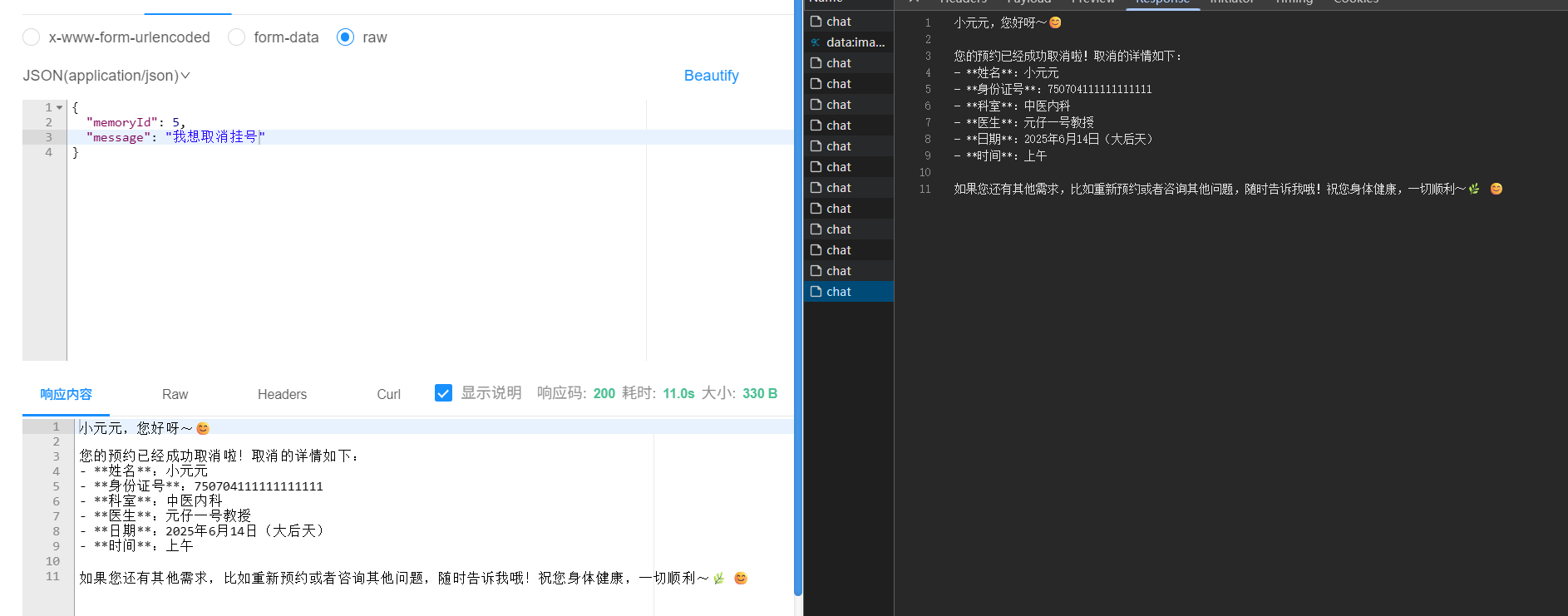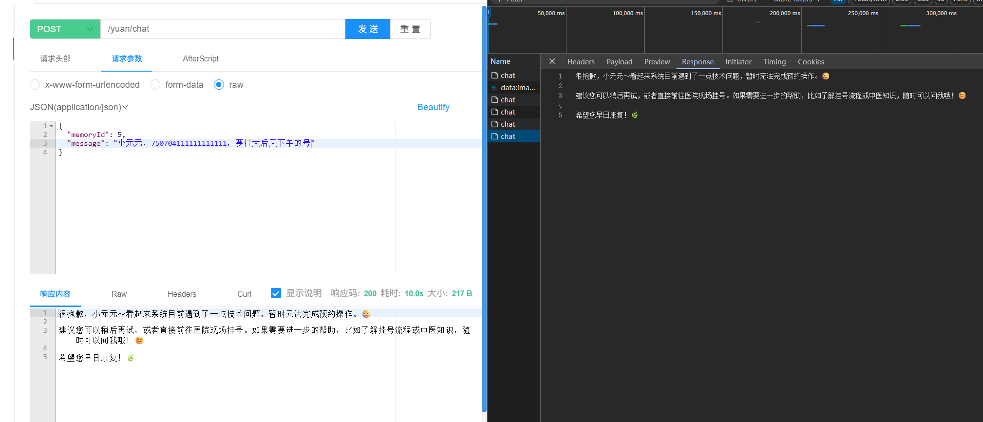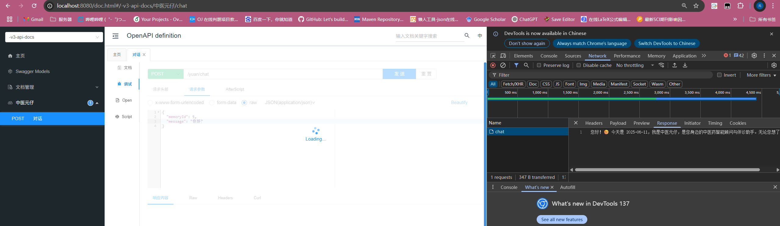 启动程序后我们打开swagger的调试,输入信息就可以看到回复,需要注意的是,流式输出的效果只能在开发者面板F12->Network->Response的chat中看到:
