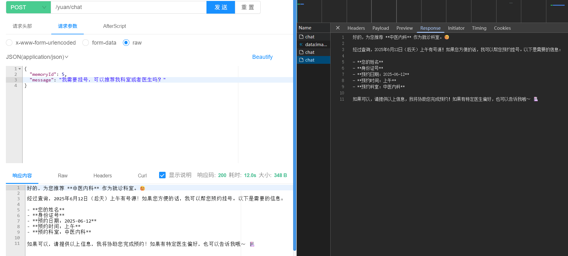 chatMemory = "chatMemory",我们把它放在config包下:import dev.langchain4j.memory.ChatMemory; import dev.langchain4j.memory.chat.MessageWindowChatMemory; import org.springframework.context.annotation.Bean; import org.springframework.context.annotation.Configuration; /** * MemoryChatAssistantConfig - com.yuan.yuanlangchain4j.config */ @Configuration public class MemoryChatAssistantConfig{ // 这个bean对象用于注入到MemoryChatAssistant中的 // @AiService的chatMemory属性中 @Bean public ChatMemory chatMemory() { //最多记住最近 10 条消息 return MessageWindowChatMemory.withMaxMessages(10); } }然后我们就可以测试一下它的效果了: