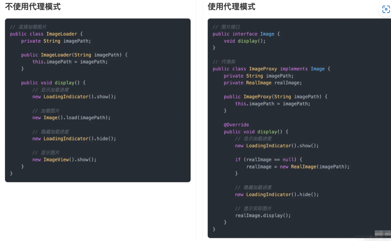 通过对比可以看出,不使用代理模式时,图片加载的逻辑直接写在 ImageLoader 类中,这导致了职责混乱、代码耦合度高、难以扩展等问题。当需要添加新的图片处理功能时,需要修改现有代码,增加了维护成本。