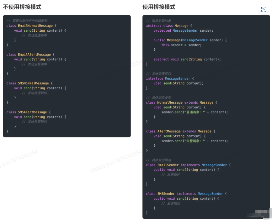 通过对比可以看出,不使用桥接模式时,我们需要为每种消息类型和发送渠道的组合创建一个单独的类这导致了类的数量过多,代码重复度高,难以维护。每当需要添加新的消息类型或发送渠道时,都需要创建大量的新类。