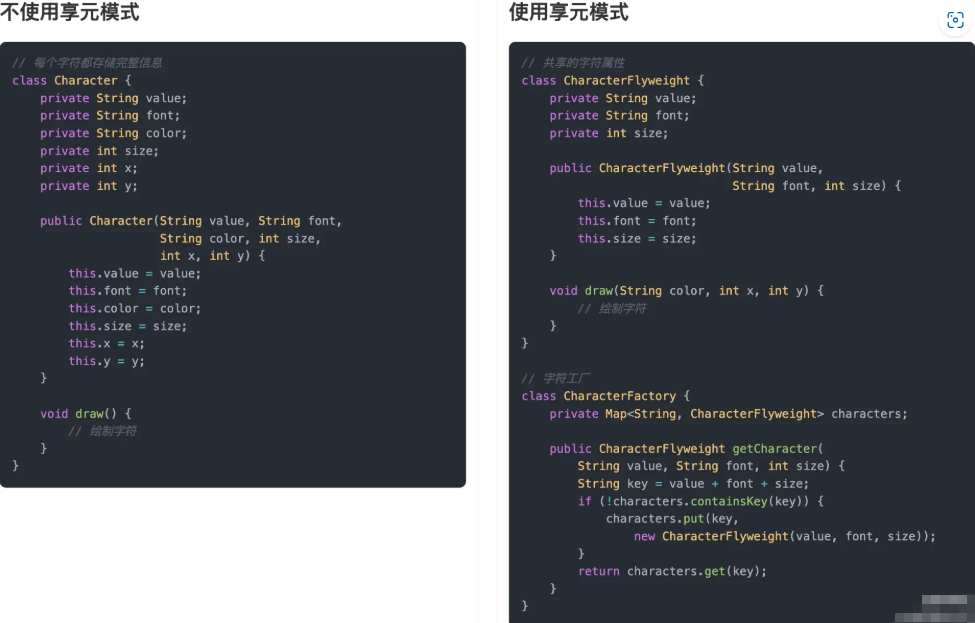 文本编辑器中的字符缓存:在文本编辑器中,可能会有大量相同的字符(如重复出现的字母、符号等)。而每个字符的显示样式(如字体、颜色、大小)可能是相同的。通过享元模式,可以将共享的字符属性(如字形、字体)提取出来作为享元对象,只保存那些需要变化的属性(如位置、颜色),减少重复存储,提高系统效率。