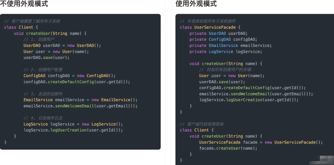 通过对比可以看出,不使用外观模式时,客户端需要直接与多个子系统(数据访问、邮件服务、日志服务)交互,这导致了代码耦合度高、调用复杂、难以维护等问题。每当需要修改注册流程时,都需要修改多处代码,增加了开发成本。